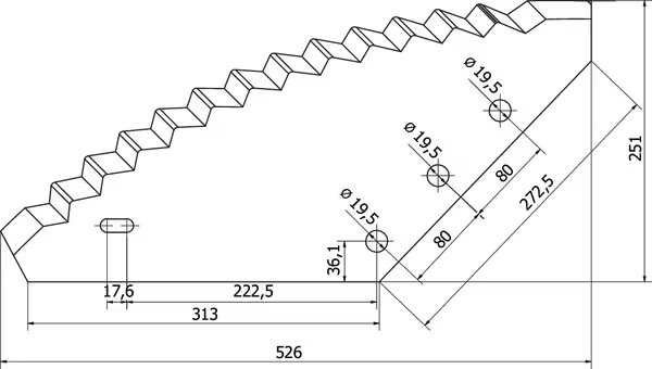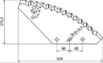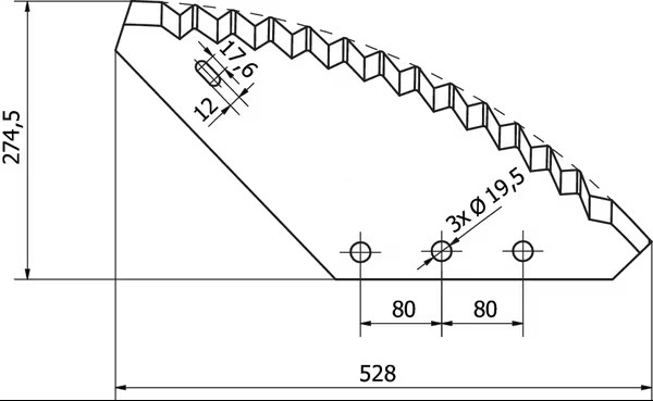 🔪 Barības dalītāja nazis 528×274×6 mm, Ø19,5 mm – kvalitatīvs rezerves nazis, paredzēts dažādu ražotāju barības dalītājiem. Piemērots Faresin, Frasto, OMAS, Peecon, Unifeed, Van Lengerich, RMH, BVL, Fimaks tehnikai. Precīzi izmēri nodrošina lielisku saderību un uzticamu darbību. Ideāls risinājums efektīvai skābbarības, siena un lopbarības griešanai ikdienā.