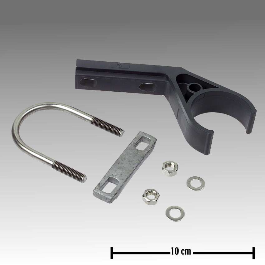 Komplekts ietver U-veida skavu, kas ļauj viegli un droši piestiprināt cauruli pie konstrukcijas.