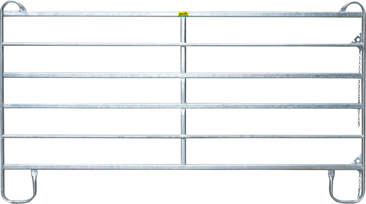 Patura Panel-6 ganību / žoga panelis 4,00 × 1,70 m ar 2 centrālajiem balstiem ir īpaši izturīgs profesionāls risinājums liellopu, teļu, kazu, aitu, zirgu un citu lauksaimniecības dzīvnieku drošai norobežošanai intensīvas slodzes apstākļos. Palielinātais 4,00 m garums apvienojumā ar diviem centrālajiem balstiem nodrošina maksimālu konstrukcijas stingrību, samazina savienojumu skaitu un palielina stabilitāti plašos aplokos, garos koridoros un darba zonās. Karsti cinkotais tērauds garantē ilgu kalpošanas laiku un drošu lietošanu gan fermā, gan āra apstākļos.