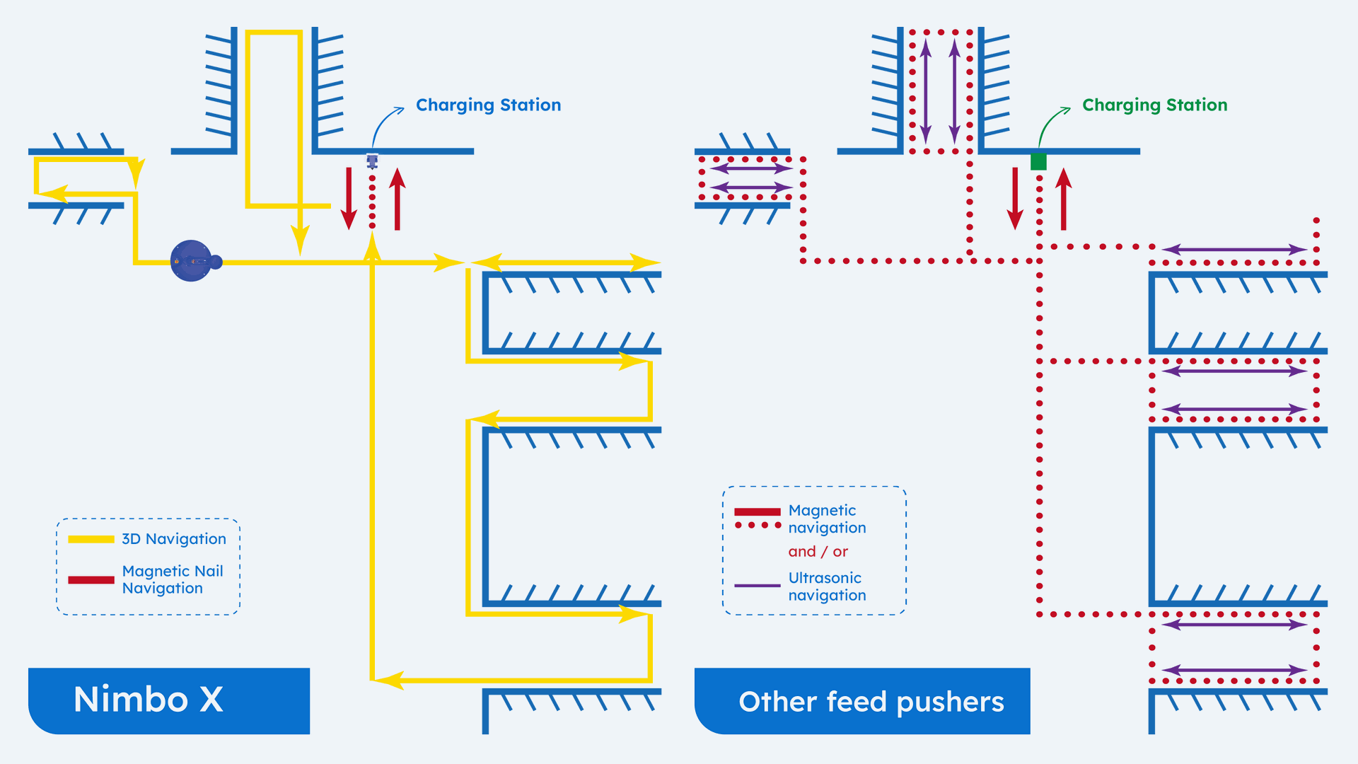 Magnētiskā navigācija ar naglām (2–3 m no uzlādes stacijas, ≈35 naglas)