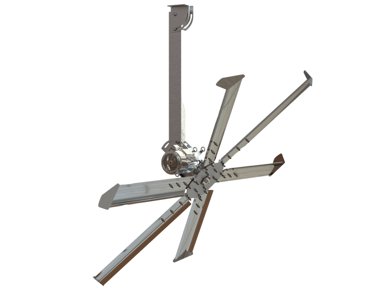 fermām ventilators, helikoptera tipa ventilators, ventilators kūtīm, ventilācijas sistēma govīm, gaisa plūsmas uzlabošana fermā, zemenerģijas ventilators, alumīnija ventilators, EASY KLIMA ventilators, ventilācijas risinājumi fermām, liellopu kūts ventilācija