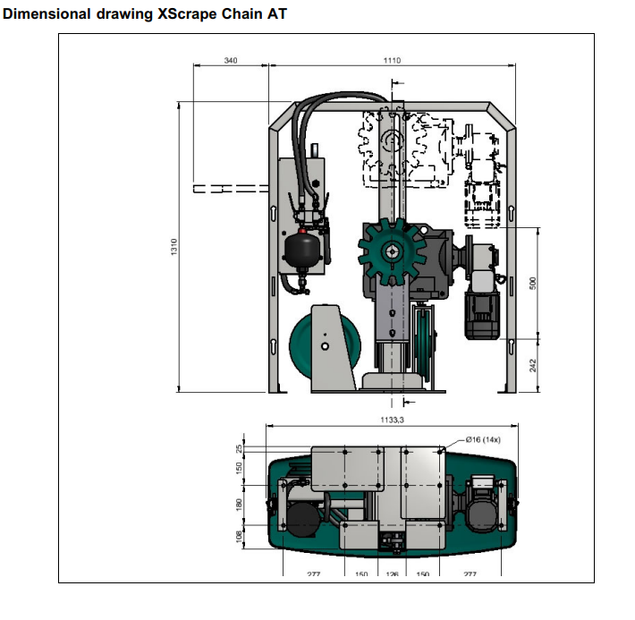 XScrape Chain AT III 0,75 kW – profesionali mėšlo šalinimo stotis betoninėms grindims su automatiniu grandinės įtempimu. Užtikrina efektyvų mėšlo transportavimą, didelę traukos jėgą ir mažesnes priežiūros sąnaudas pieno ūkiuose.